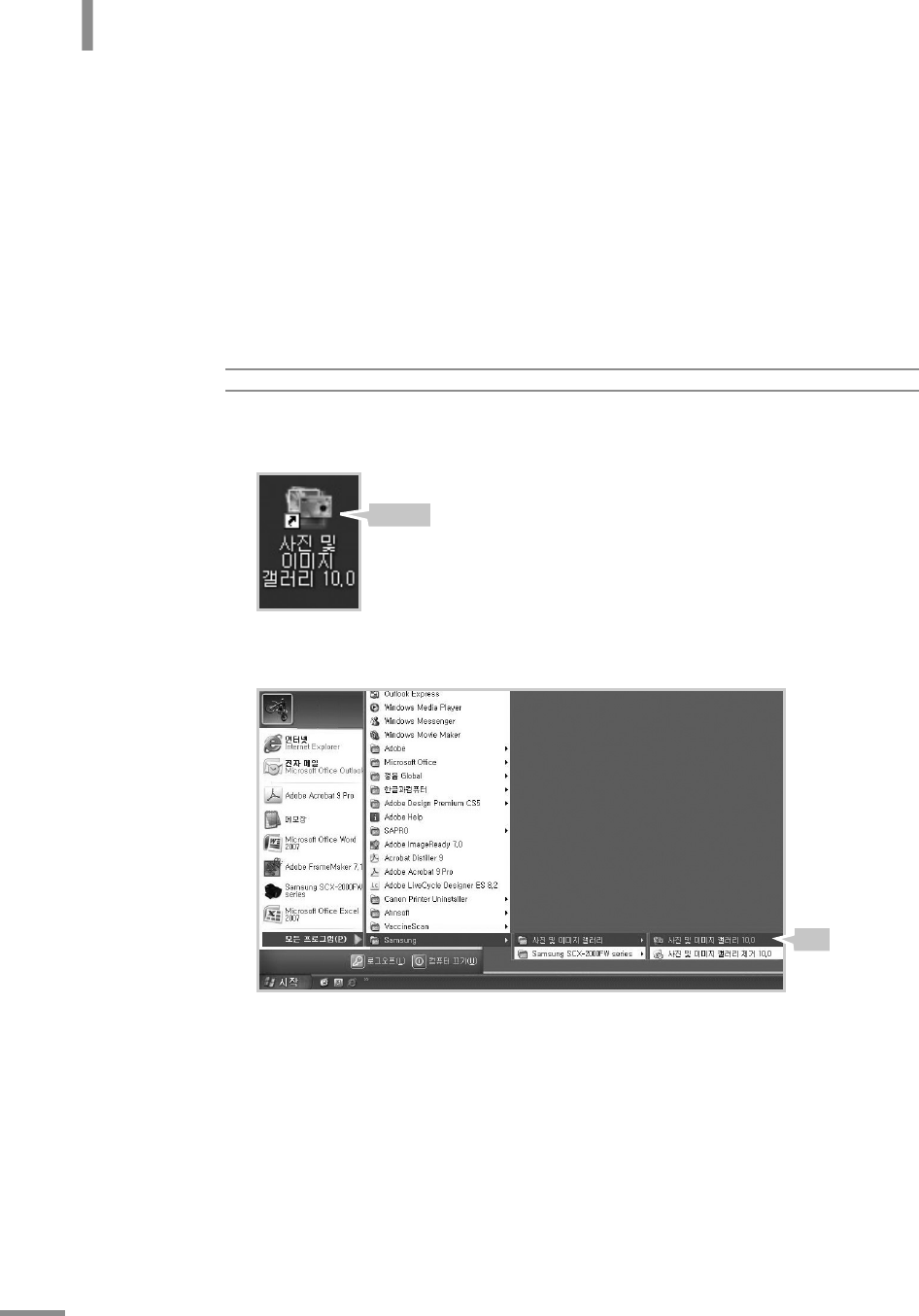 < 시작 > 메뉴에서 < 모든 프로그램 > → <Samsung> → < 사진 및 이미지 갤러리 > →